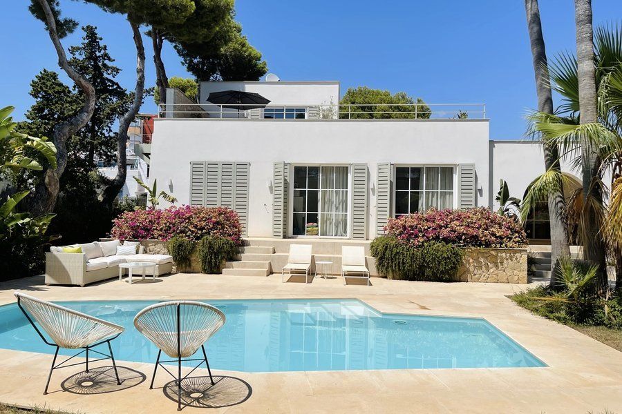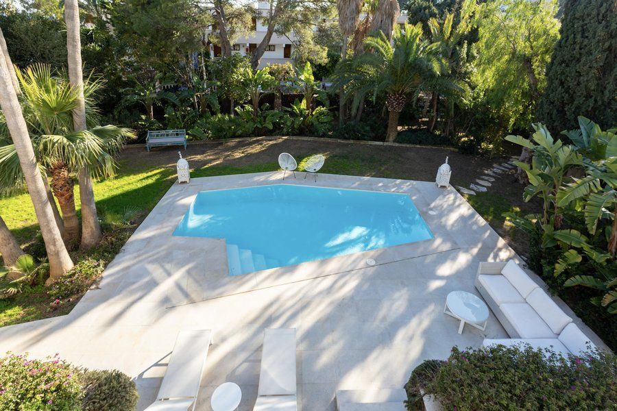 Available July and August. This wonderful, very modern and luxurious house of approx. 218 sqm is divided into an open kitchen with a spacious dining and living area. The hallway leads to 3 bedrooms, a master bedroom with en-suite bathroom and another separate guest room with guest toilet. The beautiful natural stone floors, glamorous furniture and decor create a lasting holiday feeling of relaxation and good energy. From all bedrooms and parts of the living area you have access to the garden, which is planted with beautiful wild bananas and palm trees and leads to the 30 sqm saltwater pool, where you can take a refreshing dip in the warmer summer months. There is also a covered terrace with a seating area and a large and beautiful wooden dining table where you can dine al fresco all year round. \nThe house has a separate guest studio with bathroom, which can be reached via a separate external staircase. There is a large and sunny terrace of over 40 sqm where you can enjoy the beautiful sun or even practice yoga at sunset. The house is fully equipped for a comfortable stay with central air conditioning (hot/cold), a cosy fireplace, alarm system and there are two parking spaces with both covered and uncovered parking. Nearby amenities, restaurants and beautiful beaches are within walking distance.