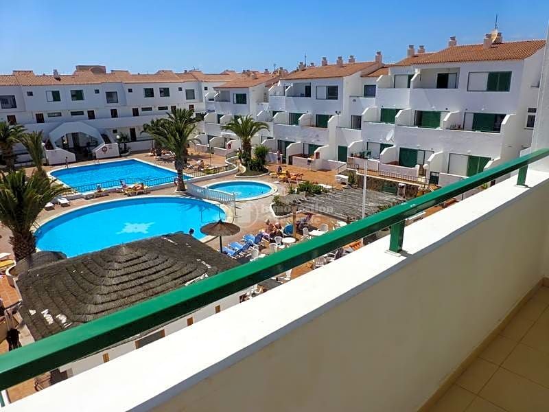 This approximately 68 m² apartment features 2 bedrooms, 1 bathroom, a fully equipped open-plan kitchen, and a living/dining room with access to a spacious balcony (approx. 12 m²) overlooking the pool. The complex offers a restaurant, bar, and more.