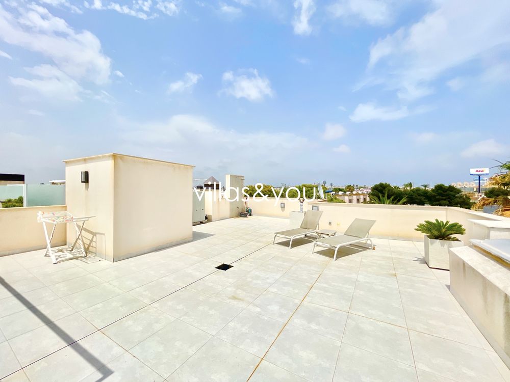 The apartment is located in a gated community with communal swimming pool and boasts 3 bedrooms, 2 bathrooms, a large living/dining room with American kitchen, balcony and a large private roof terrace with outdoor furniture.