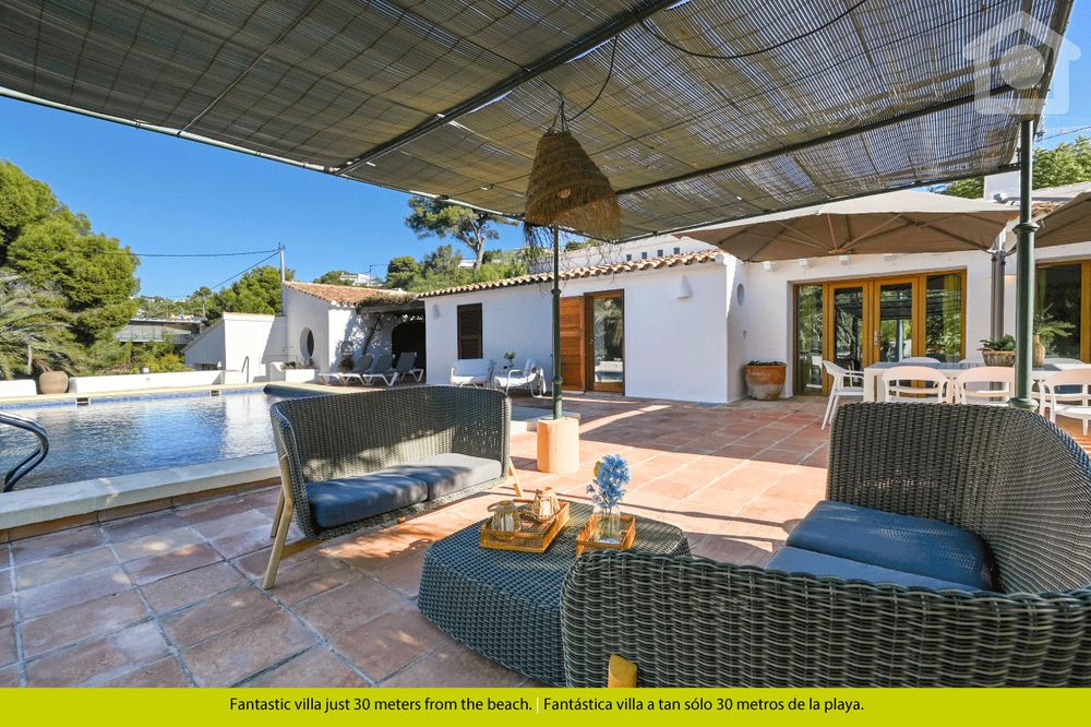 This beautiful villa is situated BY THE SEA, in a privileged place. Located on one of the most beautiful beaches of the Costa Blanca, just within an 8 minutes drive from the charming fishing village of Moraira, famous for its spectacular sandy beaches and crystal clear waters.