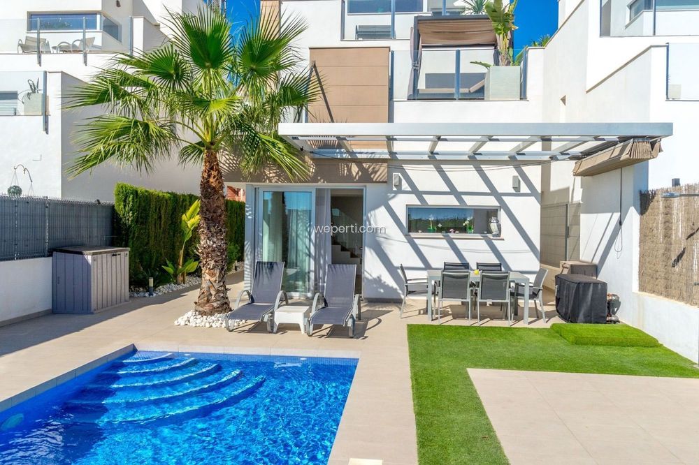 Tiene piscina propia y aparcamiento. En la planta baja una amplia sala de estar, cocina abierta, 2 dormitorios y 2 baños y en el primer piso encontrará el tercer dormitorio con baño privado. Además, hay un gran solarium en la planta superior.