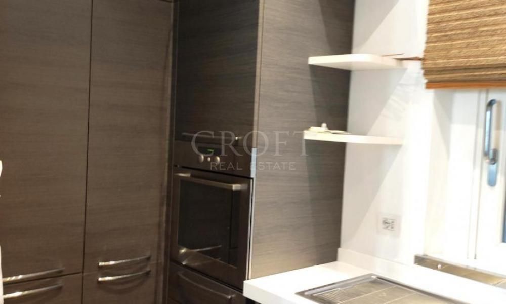 The modern, fully equipped kitchen features a convenient sliding door, separating it from the living area while maintaining a seamless flow.