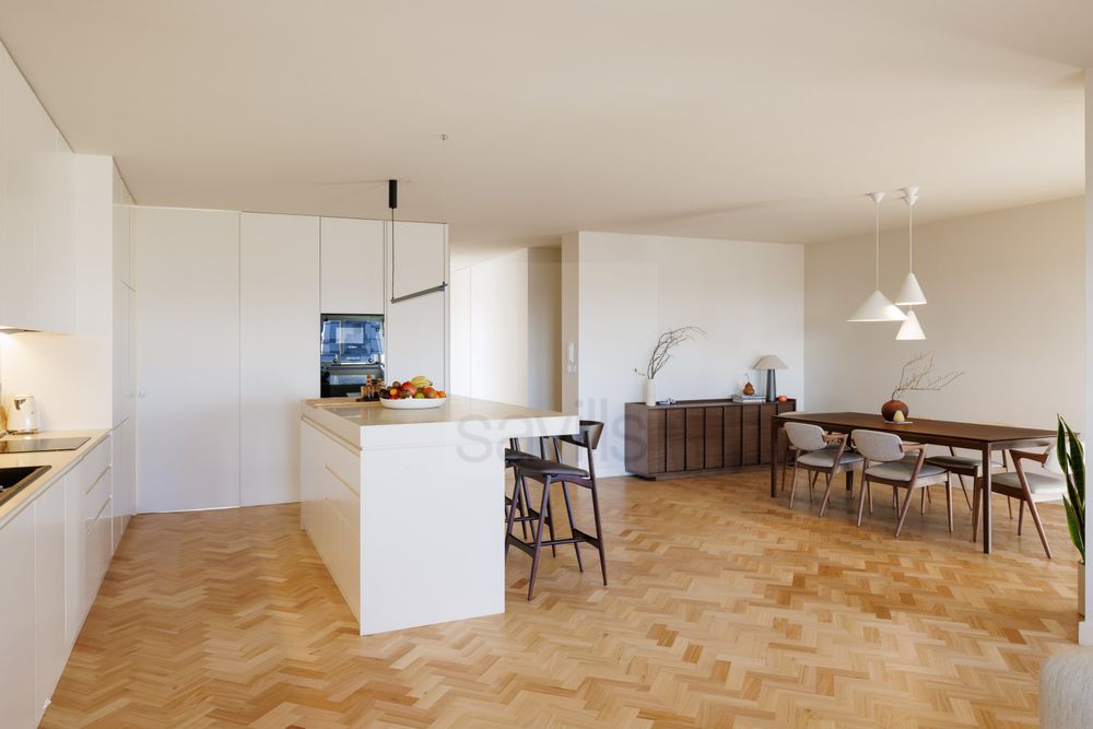 Acedendo ao apartamento, deparamo-nos a Sul com a ampla sala de estar e jantar e, cozinha. Totalmente janelada, esta área permite uma vivência impar com o exterior.